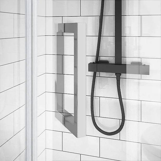 - Comes with a stylish chrome finish square door handle and a pair of wall mounted square support arms.