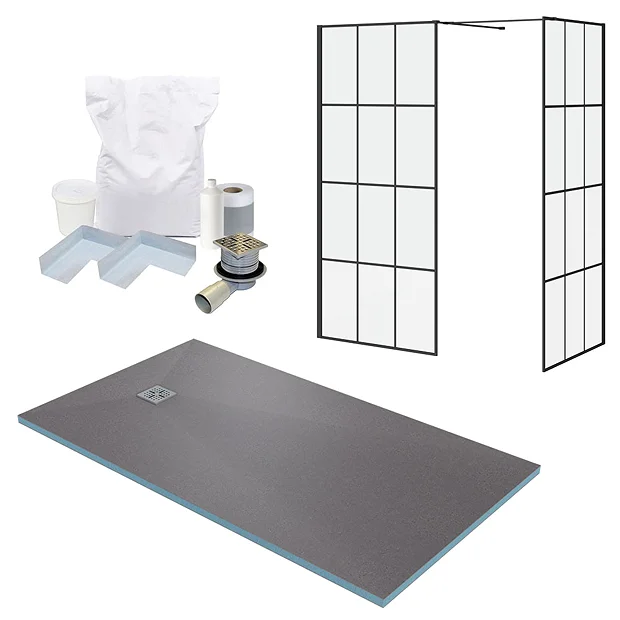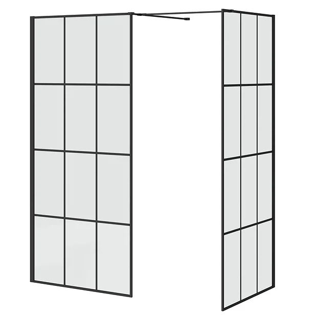 Create a sleek showering area with one of our wet room packages, features a 8mm-thick glass screens, matt black profile with matching square support arms, tray former, shower waste and installation kit. Glass screens have stunning digitally printed black grid pattern detailing that will bring a touch of sophistication in your bathroom.Â