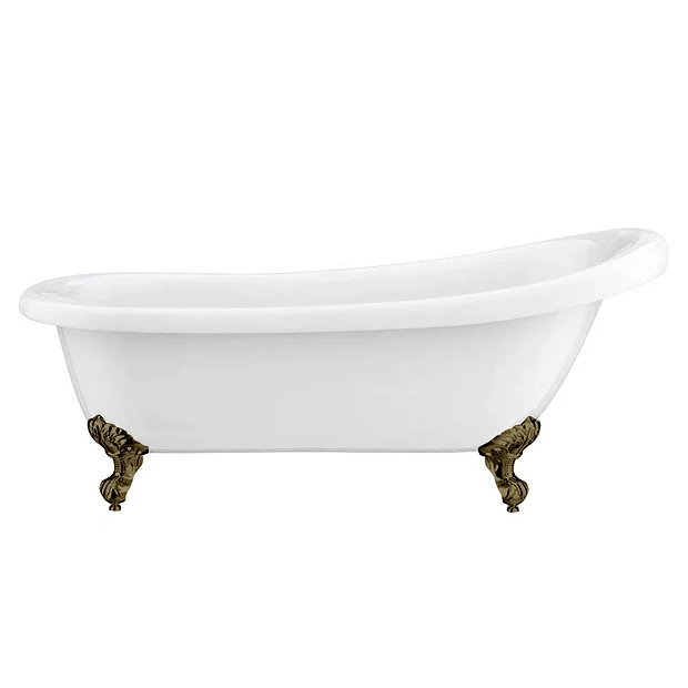 A stunning 1710mm long slipper bath with traditional antique brass feet, enjoy the feeling of luxury with this classical free-standing bath. This elegant slipper roll top bath is the perfect centrepiece for a traditional bathroom. The bath is mounted upon traditional brushed antique brass feet to complete a breathtaking appearance. Made with double skinned acrylic with a superb surface finish. Slipper bath has no tap holes and a continuous rolled rim.
