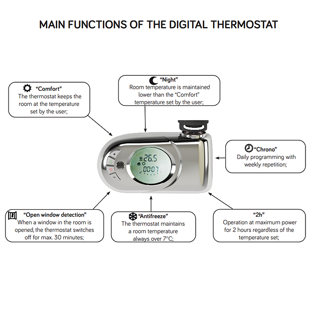 Towel rail comes with a chrome finish digital thermostat featuring five operational modes:
