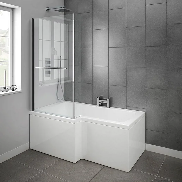 Milan L-Shaped Shower Bath 1500mm (inc. Hinged Screen with Return, Rail + Acrylic Panel)