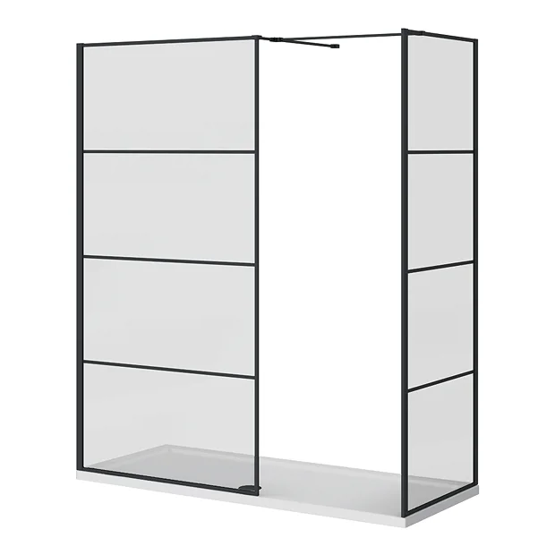 The rectangular Osaka walk-in wet room enclosure features urban inspired digitally printed statement black horizontal partition lines window-frame panelling for added dimension and depth in your bathroom. This trendy black frame shower screen is made with 8mm toughened safety glass and comes with a matt black stainless steel support bar for a contemporary touch. It comes with a white gloss walk in shower tray that’s smooth underfoot and easy to wipe clean.